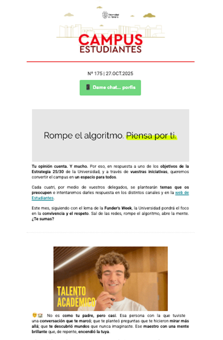 El boletín semanal de los estudiantes de la Universidad de Navarra. Cuenta la vida universitaria en estado puro, historias de alumnos, de dónde venimos, a dónde vamos, avisos importantes... ¡Todos los lunes en tu correo!